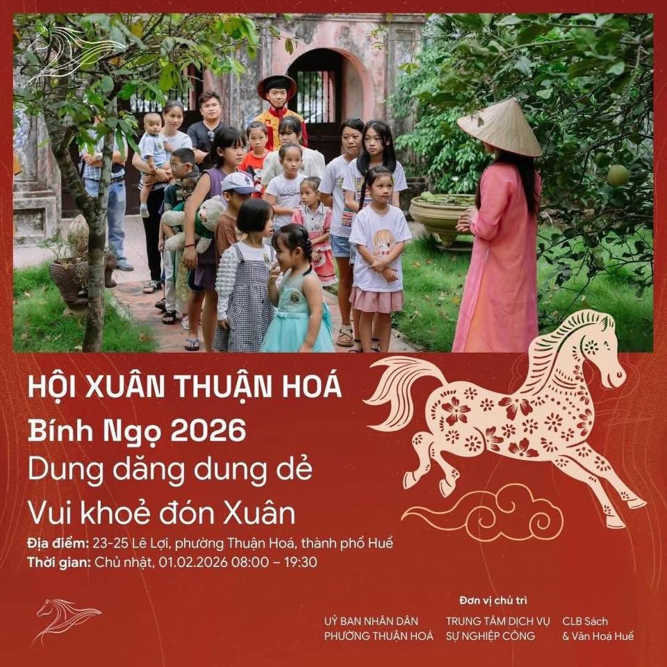 Ngày 01/02/2026, phường Thuận Hoá tổ chức Hội Xuân Thuận Hóa Bính Ngọ 2026 tại Không gian Sách & Văn hóa Huế (23–25 Lê Lợi, phường Thuận Hóa, TP Huế).